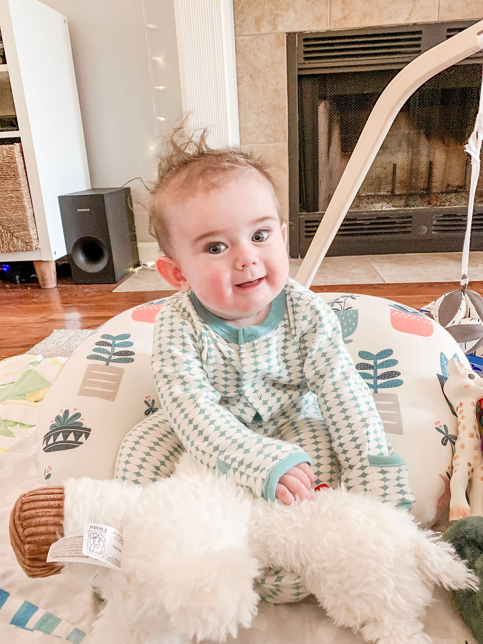Favorite Moments: You have learned so much! Lately, you’ve started copying us. About half of the time that we clap at you, you put your hands together and smile. You’re so close to clapping! Somehow you’ve taught yourself peekaboo with a blanket, and it’s adorable!